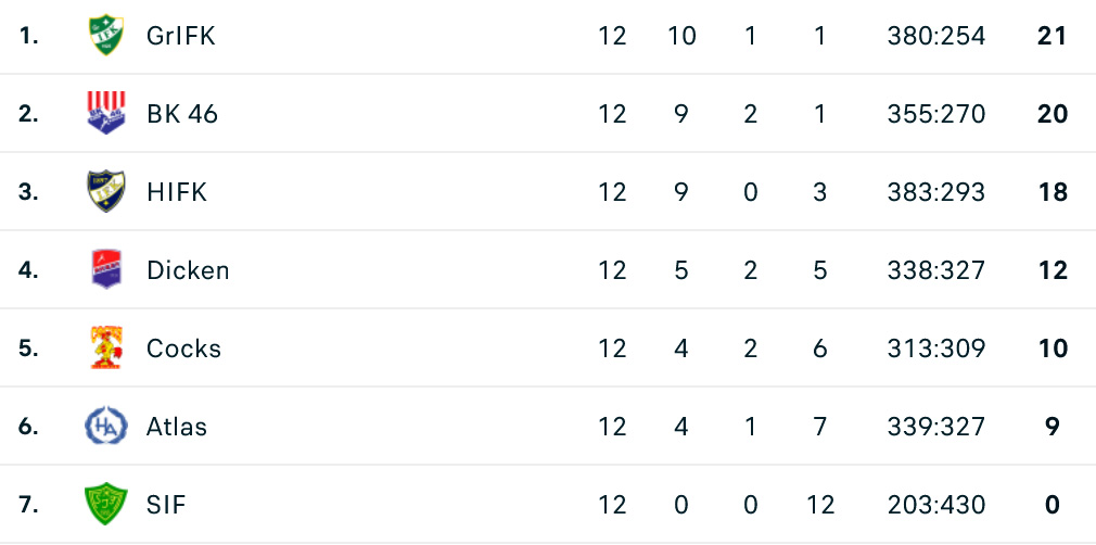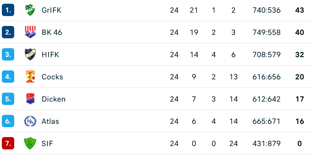 Naisten Aktialiigan runkosarjan otteluohjelma on saatu pelattua täyteen, ja pudotuspelipaikat ja -parit ovat nyt tiedossa. Kärkikaksikko GrIFK ja BK-46 varmistivat jo hyvissä ajoin paikkansa suoraan välieriin ja saavat vapaavuoron kun puolivälierät pyörähtävät käyntiin. Runkosarjan kolmoseksi pelasi itsensä HIFK selkeällä erolla ennen Cocksia, Dickeniä ja Atlasta. SIF jäi runkosarjassa tylysti pisteittä – kuten viime vuonnakin.